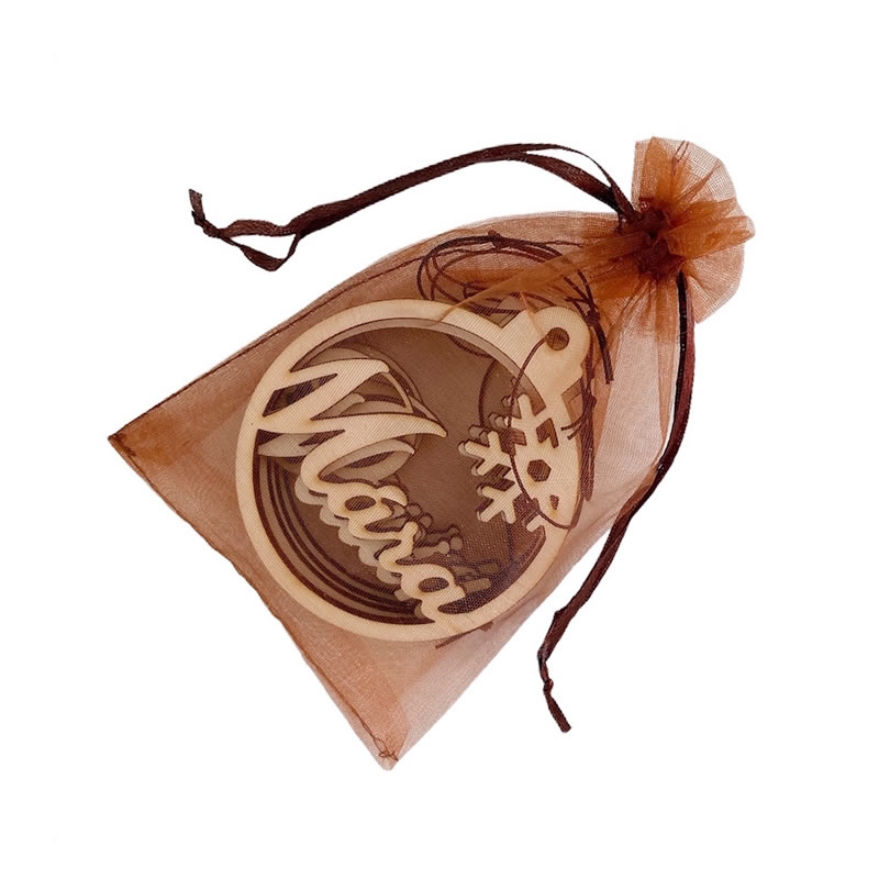 Estetický hnědý sáček z organzy se stahovací šňůrkou na drobné dřevěné dekorace z naší nabídky.