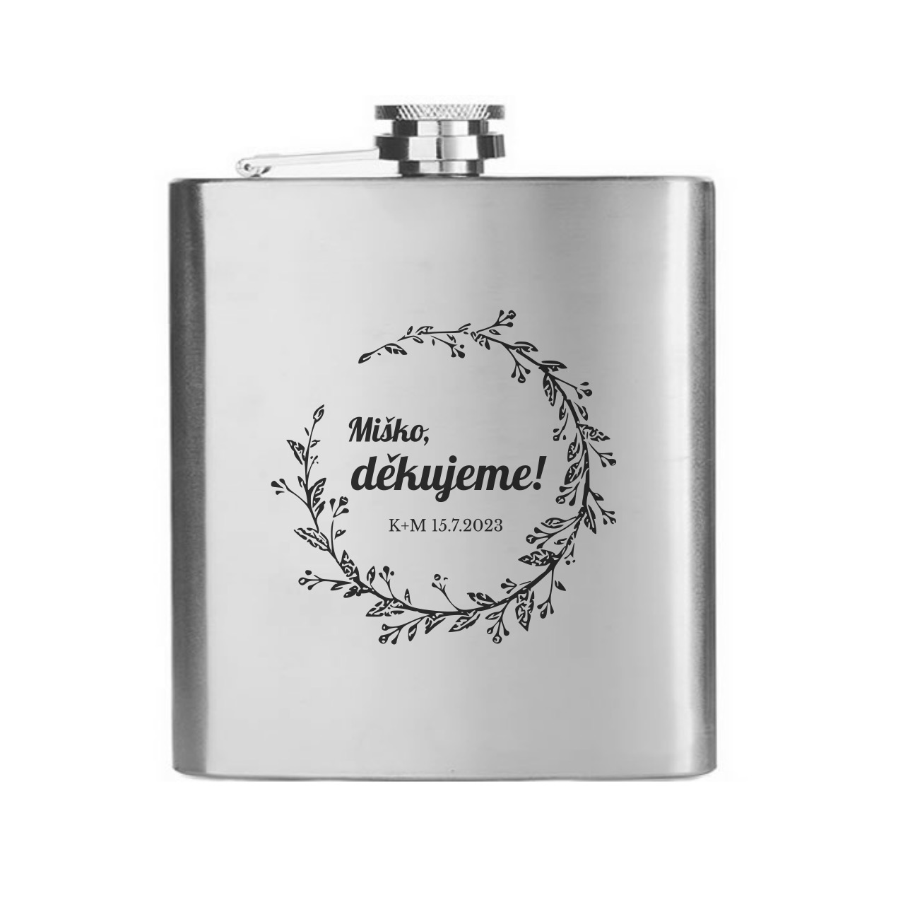 Nerezová placatka, na kterou vám pomocí laserové technologie s precizní přesností vygravírujeme jméno vašeho svědka, vaše iniciály a datum svatby do zde vyobrazeného motivu. Velikost placatky si můžete vybrat z několika objemových variant 150 / 180 / 210 / 240 nebo 270 ml.