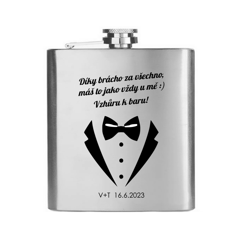 Nerezová placatka na alkohol, na kterou vám pomocí laserové technologie s precizní přesností vygravírujeme vaše iniciály a datum svatby do zde vyobrazeného motivu. Velikost placatky si můžete vybrat z několika objemových variant 150 / 180 / 210 / 240 nebo 270 ml. Tento motiv nabízíme ve více variantách (prohlédnout vše).