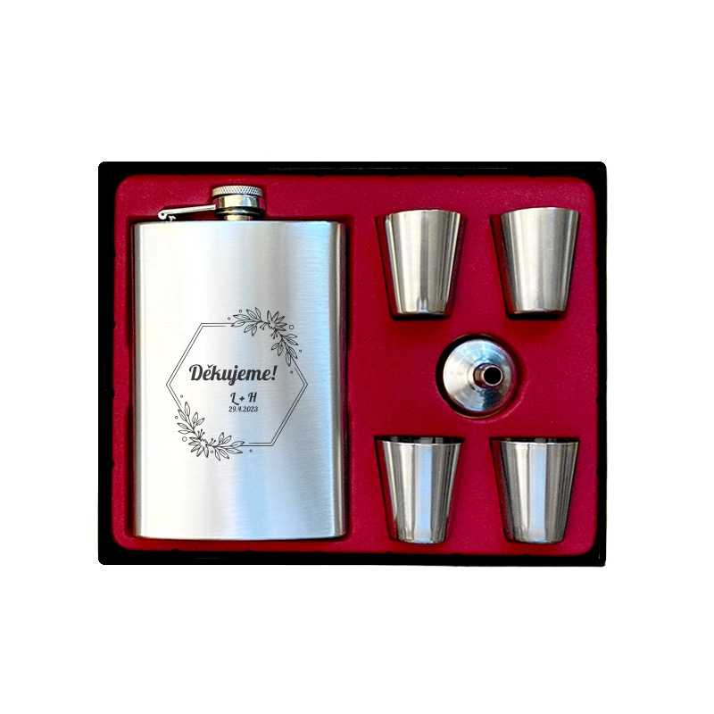 Nerezová placatka, na kterou vám pomocí laserové technologie s precizní přesností vygravírujeme vaše iniciály a datum svatby do zde vyobrazeného motivu. Velikost placatky si můžete vybrat z několika objemových variant 150 / 180 / 210 / 240 nebo 270 ml.