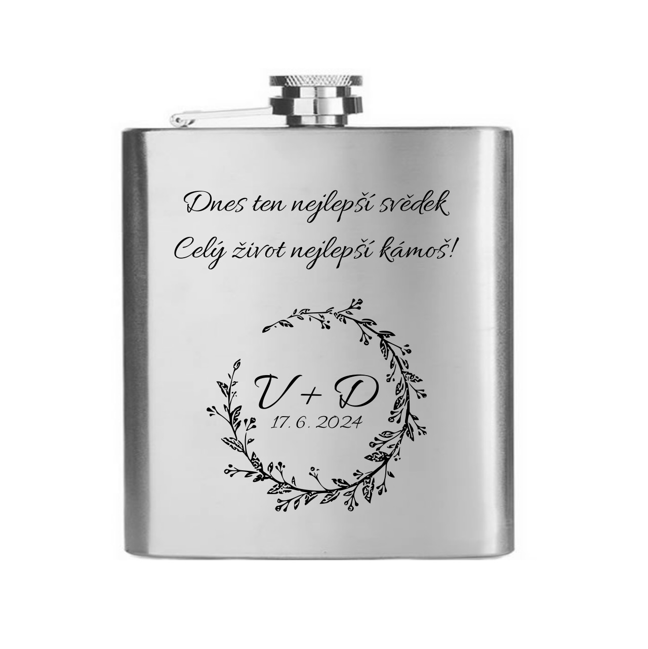 Nerezová placatka na alkohol, na kterou vám pomocí laserové technologie s precizní přesností vygravírujeme vaše iniciály a datum svatby do zde vyobrazeného motivu. Velikost placatky si můžete vybrat z několika objemových variant 150 / 180 / 210 / 240 nebo 270 ml. Tento motiv nabízíme ve více variantách (prohlédnout vše).