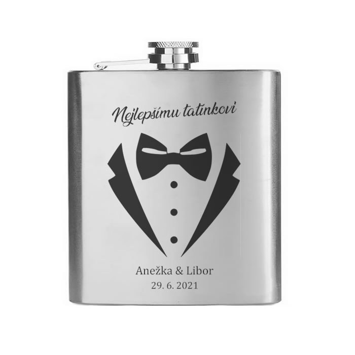 Nerezová placatka na alkohol, na kterou vám pomocí laserové technologie s precizní přesností vygravírujeme vaše iniciály a datum svatby do zde vyobrazeného motivu. Velikost placatky si můžete vybrat z několika objemových variant 150 / 180 / 210 / 240 nebo 270 ml.