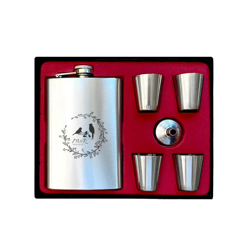 Nerezová placatka na alkohol, na které je vygravírovaný motiv viz obrázek (s úpravou na míru). Velikost placatky si můžete vybrat z objemových variant 180 / 210 / 240 nebo 270 ml.