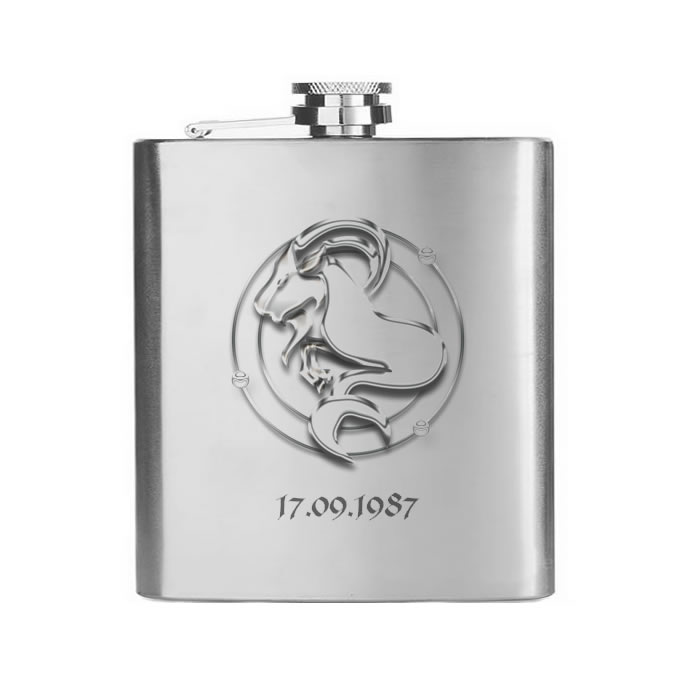 Nerezová placatka na alkohol, na které je vygravírovaný motiv viz obrázek. Velikost placatky si můžete vybrat z variant 180, 210, 240, nebo 270 ml.
