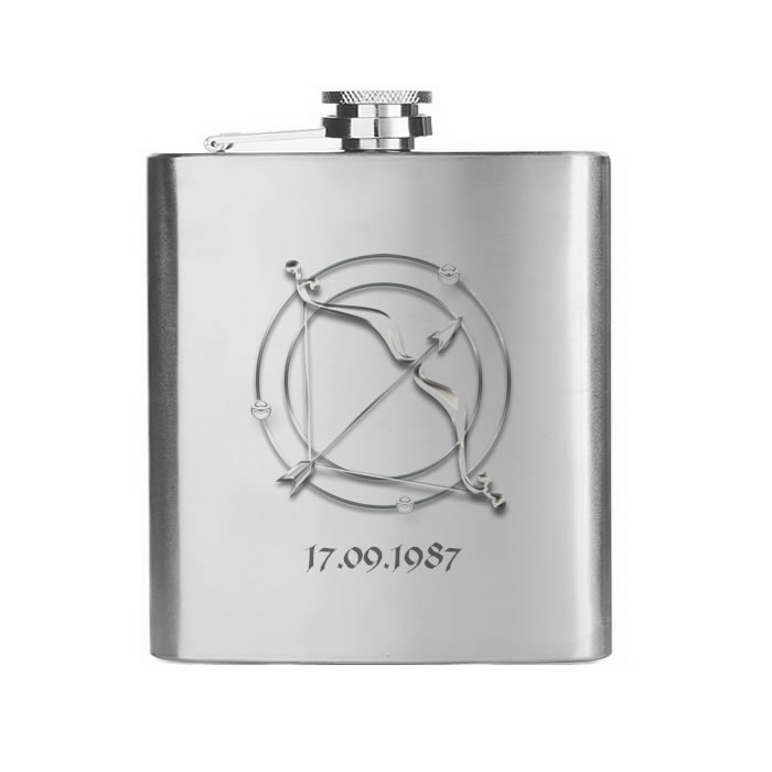 Nerezová placatka na alkohol, na které je vygravírovaný motiv viz obrázek. Velikost placatky si můžete vybrat z variant 180, 210, 240, nebo 270 ml.