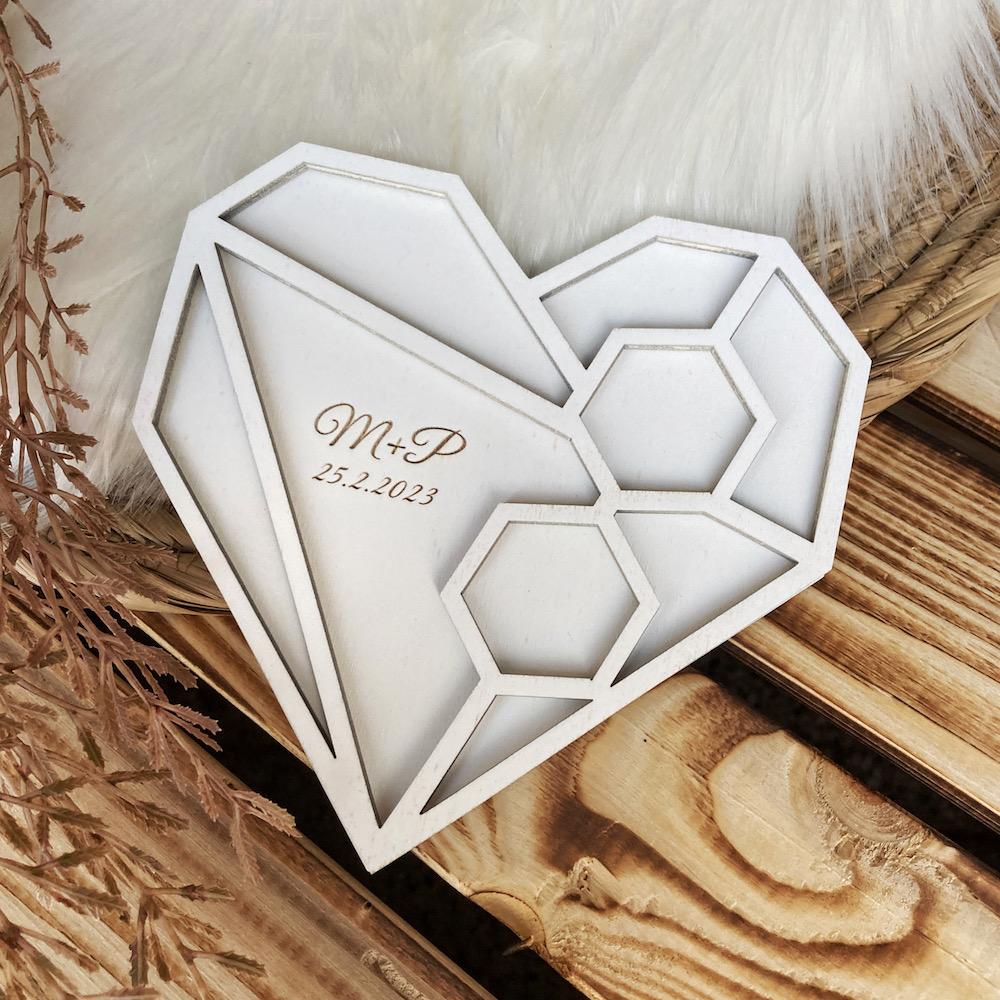 Důležitá svatební dekorace a krásná vzpomínka na váš den D, to je náš dřevěný tácek na snubní prstýnky s vašemi iniciály a datumem svatby.