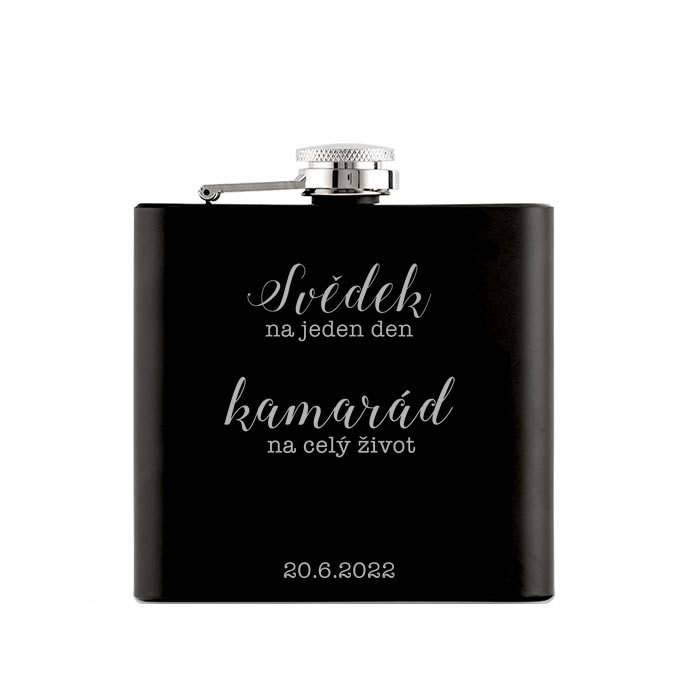 Nerezová placatka na alkohol s matným černým povrchem, na kterou vám pomocí laserové technologie s precizní přesností vygravírujeme datum vaší svatby do zde vyobrazeného motivu. Velikost placatky si můžete vybrat z několika objemových variant 180 / 210 nebo 240 ml. Tento motiv nabízíme ve více variantách (prohlédnout vše).