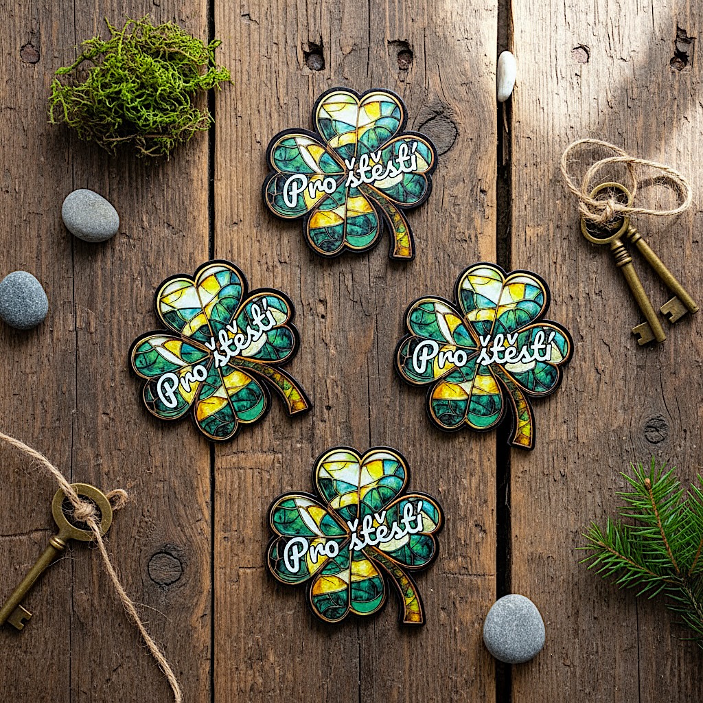 Přívěsek s motivem čtyřlístku, tradičního symbolu štěstí a pohody. Tento malovaný design zachycuje čtyřlístek v živých zelených odstínech s jemnými ornamentálními detaily uvnitř lístků. Motiv je zasazen do přírodní scenérie s rozkvetlými sedmikráskami na světle modrém pozadí, doplněný "Pro štěstí".