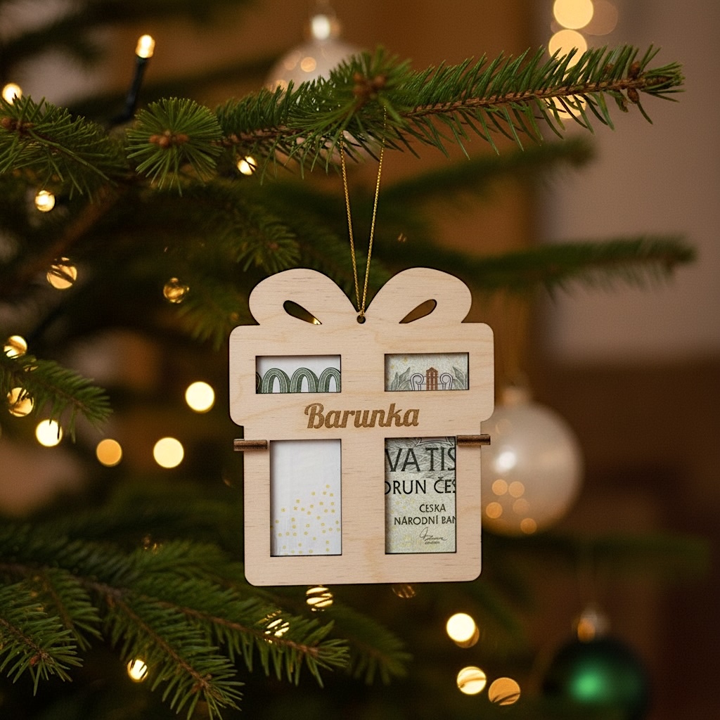 Originální dřevěný dárek ve tvaru stylizovaného balíčku s mašlí je ideální způsob, jak elegantně darovat peníze k Vánocům, narozeninám, svátku nebo jiné slavnostní příležitosti. Klip umožňuje bezpečně uchytit bankovku, kterou chcete obdarovanému věnovat. Výrobek je vyrobený z kvalitního dřeva, které ladí s každým interiérem a podtrhne slavnostní atmosféru. Díky promyšlenému designu je zároveň vkusnou dekorací, kterou lze využít jako milou upomínku.