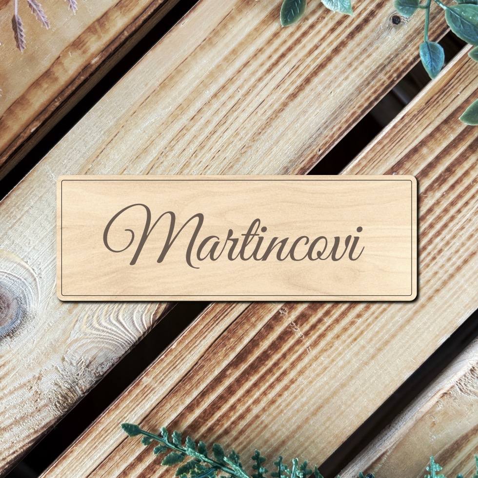 - Kvalitní zpracování: Používáme pouze ověřené dřeviny a moderní technologie, které zajistí, že vaše dřevěná jmenovka na dveře vydrží dlouhá léta pěkná a čitelná.