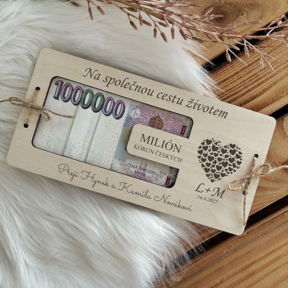 Dřevěné svatební přání "Milion korun českých" je originální a vtipný způsob, jak gratulovat novomanželům k jejich velkému dni. Přáníčka vyrobená z kvalitního dřeva zaujmou svým propracovaným designem a netradičním nápadem, který kombinuje eleganci a humor.