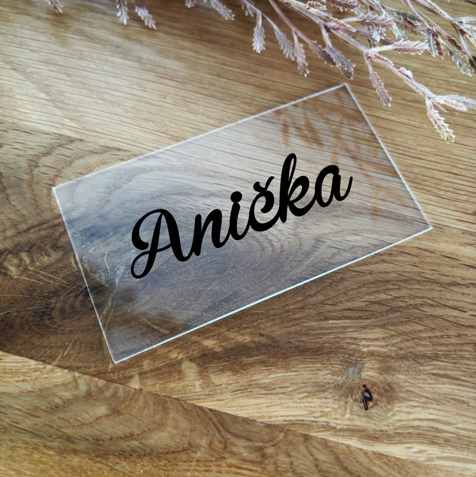 Dodejte své svatební výzdobě jedinečnost díky našim elegantním akrylovým jmenovkám. Jmenovky jsou vyrobeny z čirého akrylu, který dodává moderní a luxusní vzhled. Na každé jmenovce je stylovým písmem potisknuté jméno, čímž vytvoříte osobitý dojem na své hosty.