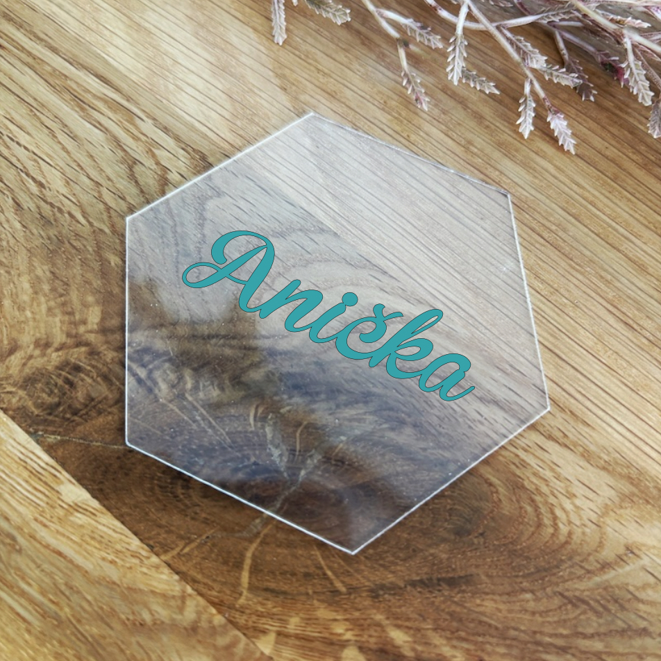 Elegantní jmenovky na svatební stůl, které dodají Vaší slavnostní tabuli výjimečný nádech. Tyto moderní jmenovky jsou vyrobeny z čirého akrylu a vytvarované do stylového šestiúhelníku.