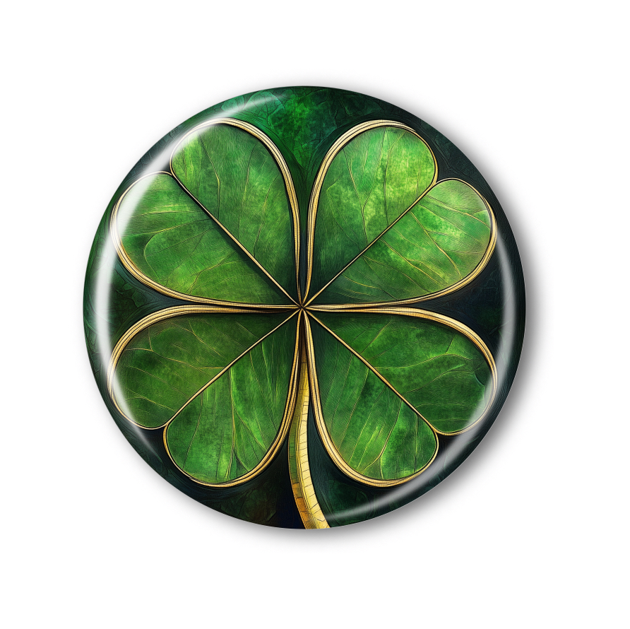 Magnetka s detailním motivem čtyřlístku přináší nejen nádherný estetický dojem, ale zároveň symbolizuje štěstí a pozitivní energii. Reálně vyobrazené zelené lístky se zlatými konturami září na tmavém pozadí, které zdůrazňuje jejich krásu a jemné provedení.
