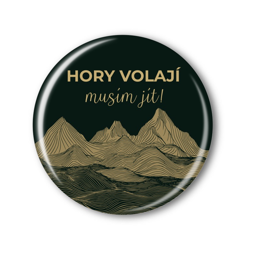 Magnetka zobrazuje elegantní design inspirovaný přírodou. Na tmavě zeleném pozadí se nachází stylizované horské panorama, které je vytvořeno pomocí jemné linie. Hory jsou zlatou barvou vyvedeny v detailních vlnách, což přidává na hloubce a textuře. Hlavním prvkem je inspirující text „HORY VOLAJÍ, MUSÍM JÍT!“, který je umístěn nahoře a vyznačuje se výrazným písmem.