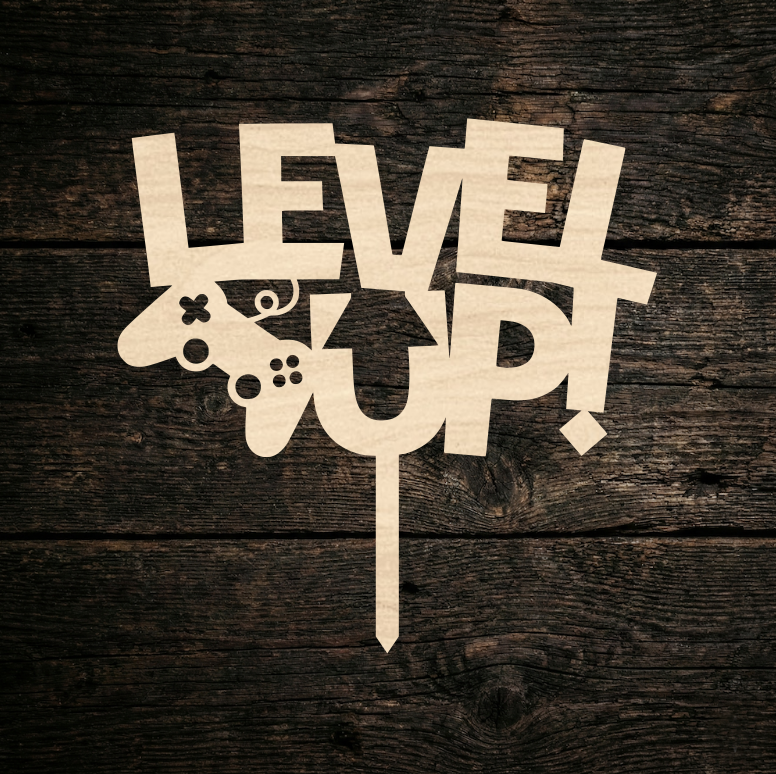 Narozeninový zápich na dort s herním motivem a nápisem „LEVEL UP!“. Design působí jako výřez z dřevěného materiálu v přírodním odstínu a je doplněný siluetou herního ovladače. Zápich stačí zapíchnout do dortu, cupcaků nebo dezertů a okamžitě vytvoří jasné „gamer“ téma.