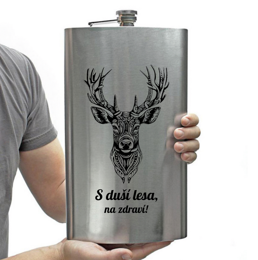 Obří nerezová placatka o objemu 1,9 litru je nejen praktickým doplňkem pro milovníky přírody, ale i jedinečným dárkem, který zaujme svým designem. Na přední straně placatky se nachází stylový motiv propracovaného jeleního paroží a text „S duší lesa, na zdraví!“, který oslavuje spojení s přírodou a dobrou náladou.
