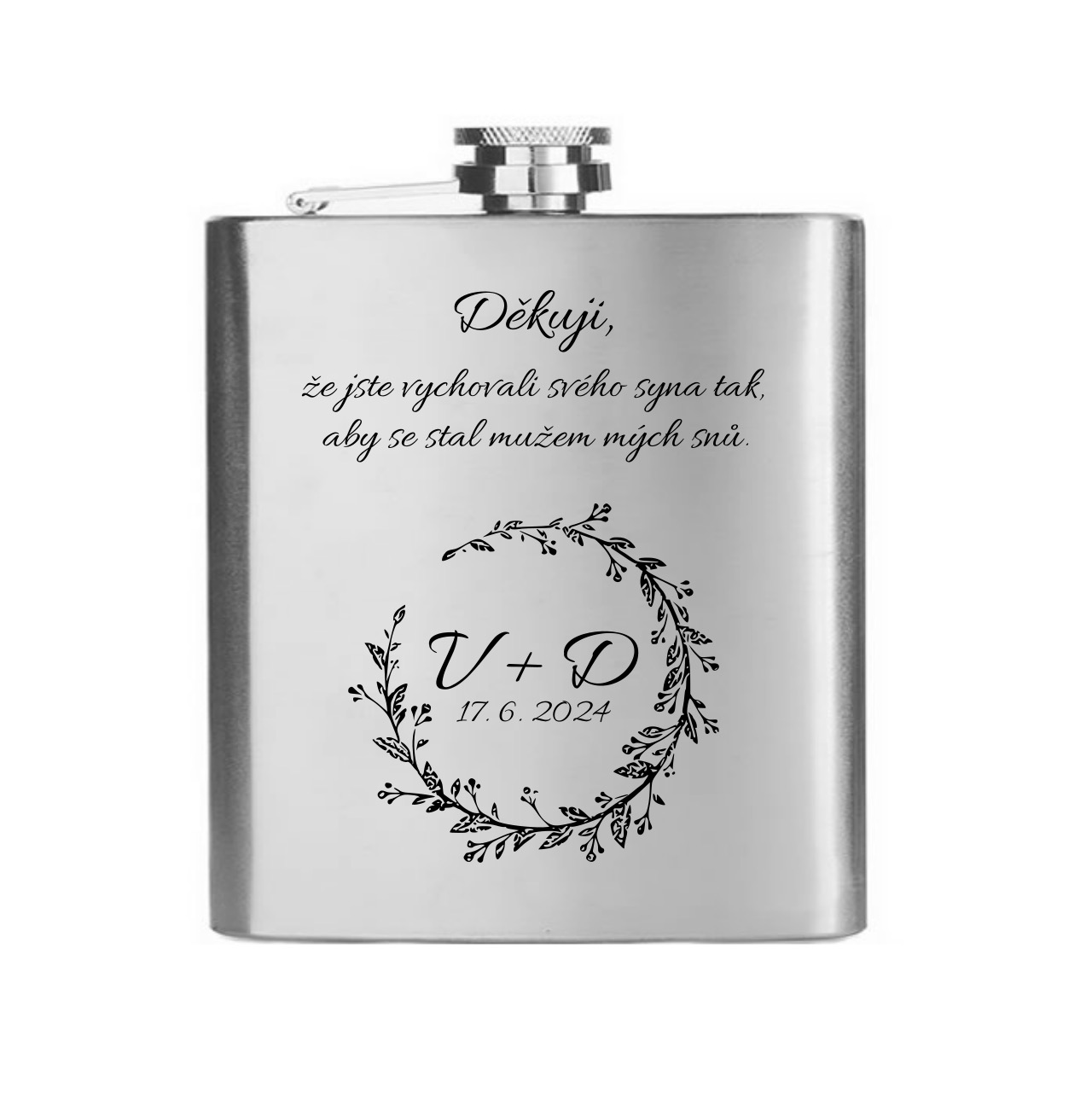 Nerezová placatka na alkohol, na kterou vám pomocí laserové technologie s precizní přesností vygravírujeme vaše iniciály a datum svatby do zde vyobrazeného motivu. Velikost placatky si můžete vybrat z několika objemových variant 150 / 180 / 210 / 240 nebo 270 ml. Tento motiv nabízíme ve více variantách (prohlédnout vše).