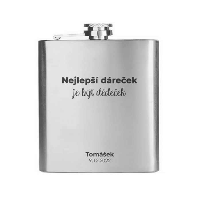 Nerezová placatka na alkohol, na které je vygravírovaný motiv viz obrázek. Velikost placatky si můžete vybrat z variant 180, 210, 240, nebo 270 ml.
