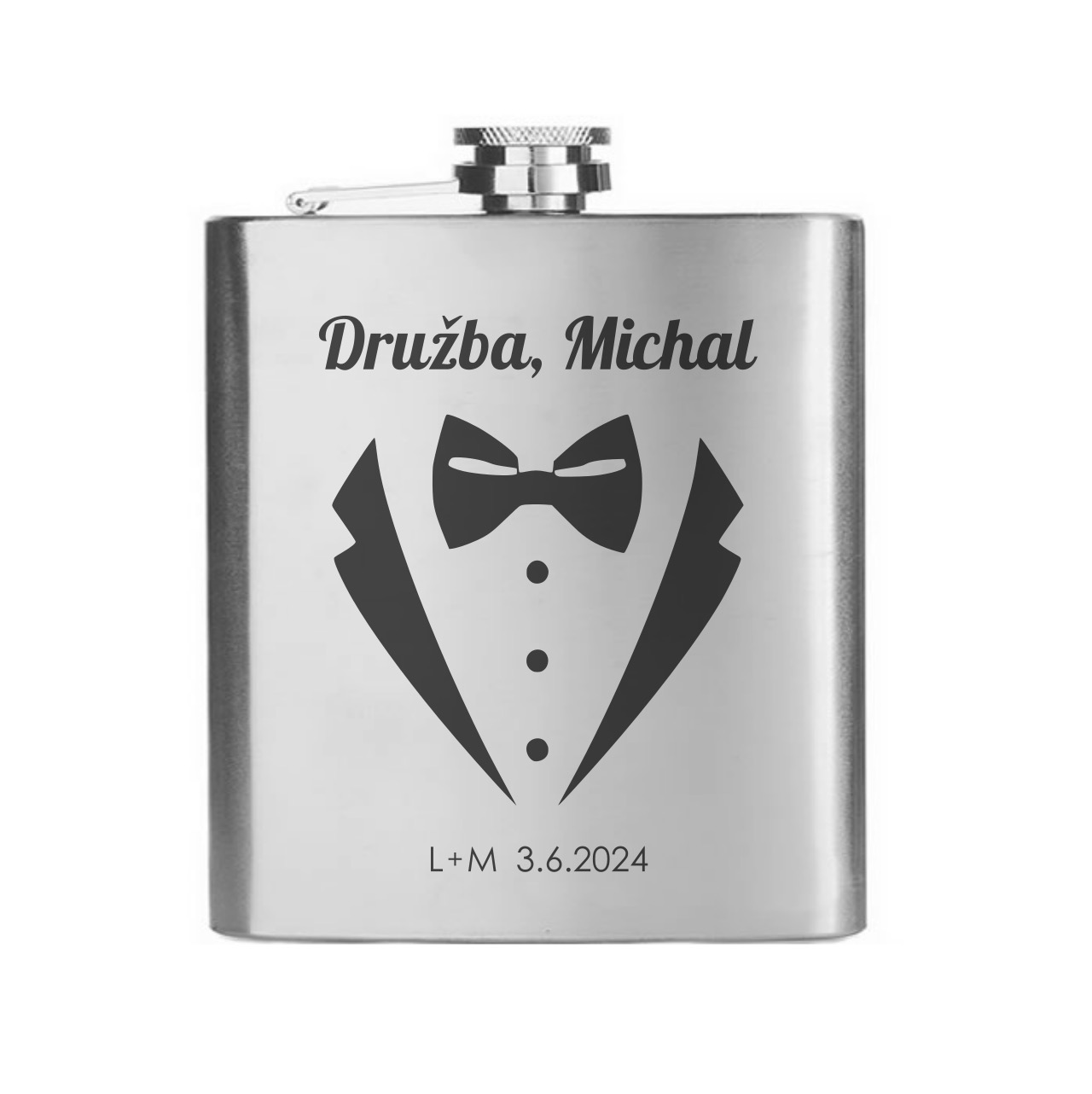 Nerezová placatka na alkohol, na kterou vám pomocí laserové technologie s precizní přesností vygravírujeme datum vaší svatby do zde vyobrazeného motivu. Velikost placatky si můžete vybrat z několika objemových variant 150 / 180 / 210 / 240 nebo 270 ml. Tento motiv nabízíme ve více variantách (prohlédnout vše).