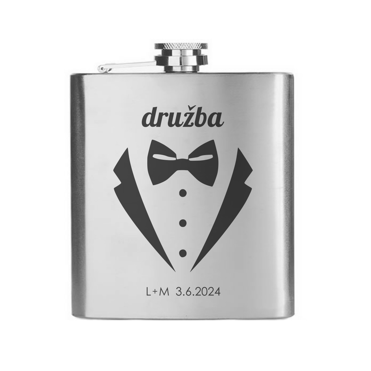 Nerezová placatka na alkohol, na kterou vám pomocí laserové technologie s precizní přesností vygravírujeme datum vaší svatby do zde vyobrazeného motivu. Velikost placatky si můžete vybrat z několika objemových variant 150 / 180 / 210 / 240 nebo 270 ml. Tento motiv nabízíme ve více variantách (prohlédnout vše).