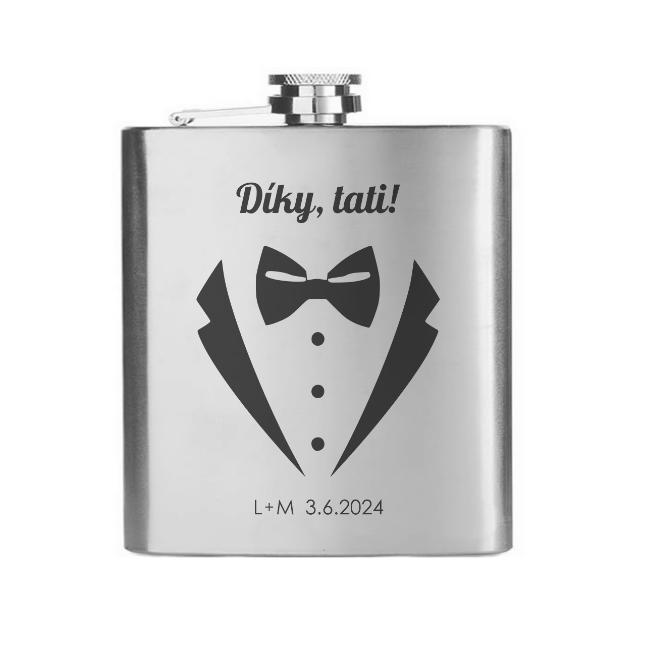 Nerezová placatka na alkohol, na kterou vám pomocí laserové technologie s precizní přesností vygravírujeme datum vaší svatby do zde vyobrazeného motivu. Velikost placatky si můžete vybrat z několika objemových variant 150 / 180 / 210 / 240 nebo 270 ml. Tento motiv nabízíme ve více variantách (prohlédnout vše).