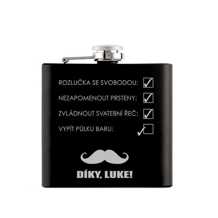 Nerezová placatka, na kterou vám pomocí laserové technologie s precizní přesností vygravírujeme jméno vašeho svědka do zde vyobrazeného motivu. Velikost placatky si můžete vybrat z několika objemových variant 150 / 180 / 210 / 240 nebo 270 ml. Tento motiv nabízíme ve více variantách (prohlédnout vše).