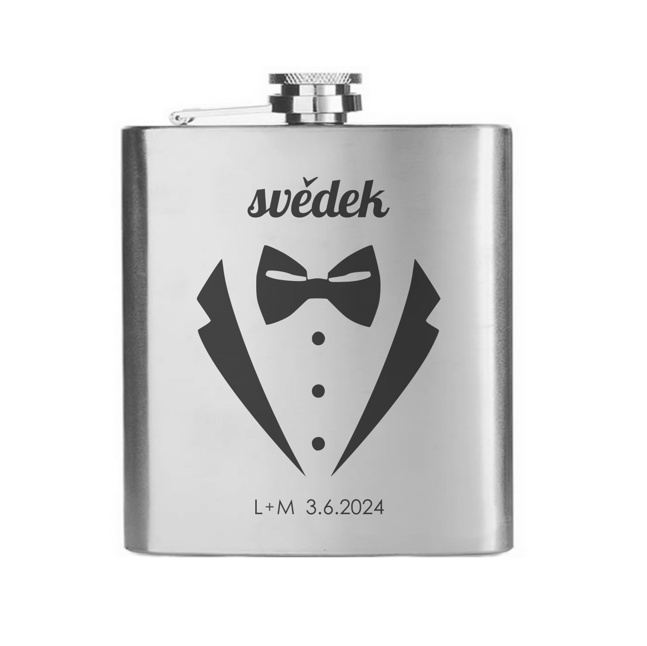 Nerezová placatka na alkohol, na kterou vám pomocí laserové technologie s precizní přesností vygravírujeme datum vaší svatby do zde vyobrazeného motivu. Velikost placatky si můžete vybrat z několika objemových variant 150 / 180 / 210 / 240 nebo 270 ml. Tento motiv nabízíme ve více variantách (prohlédnout vše).