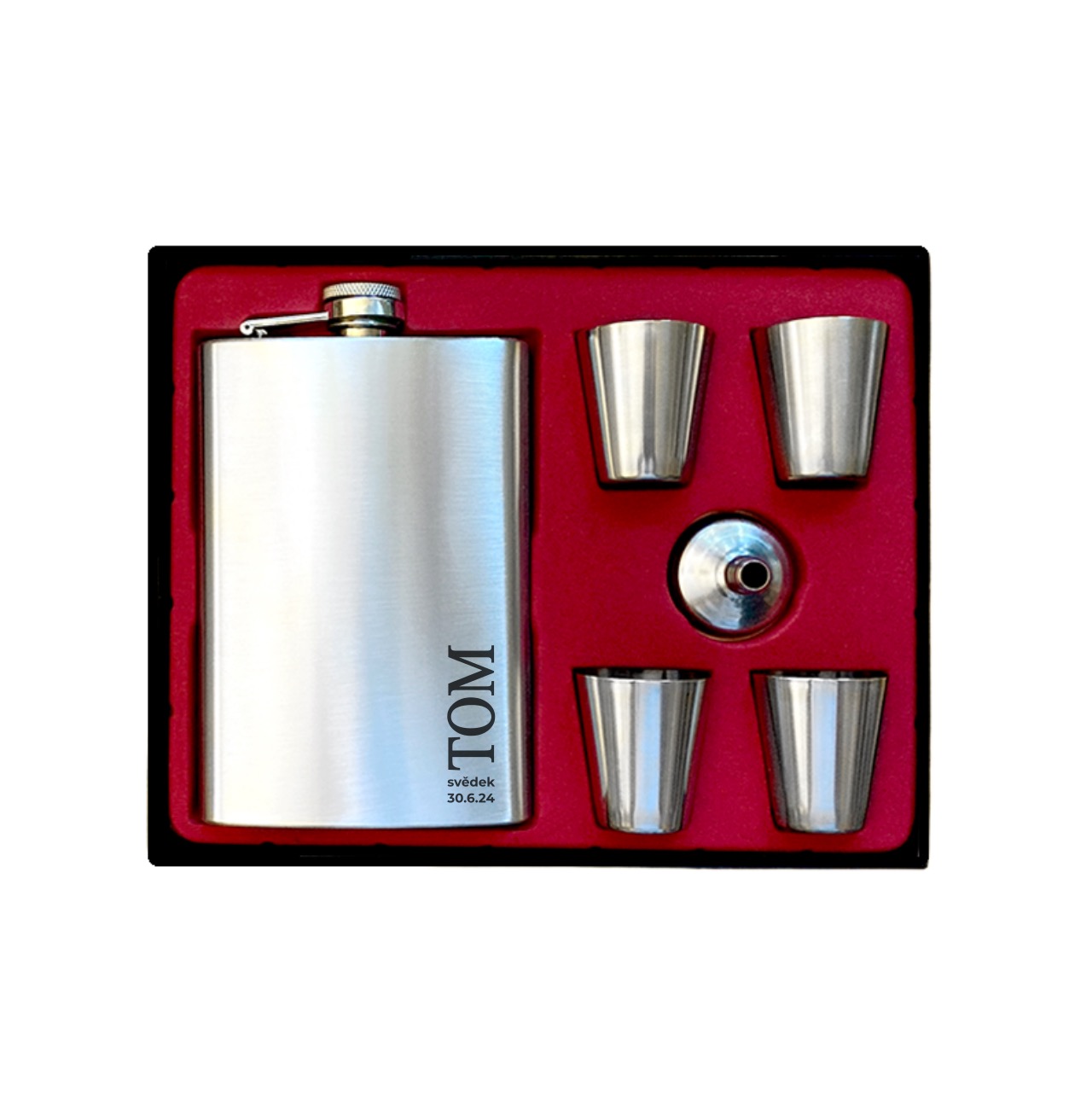 Nerezová placatka, na kterou vám pomocí laserové technologie s precizní přesností vygravírujeme jméno vašeho svědka a datum svatby do zde vyobrazeného motivu. Velikost placatky si můžete vybrat z několika objemových variant 150 / 180 / 210 / 240 nebo 270 ml.