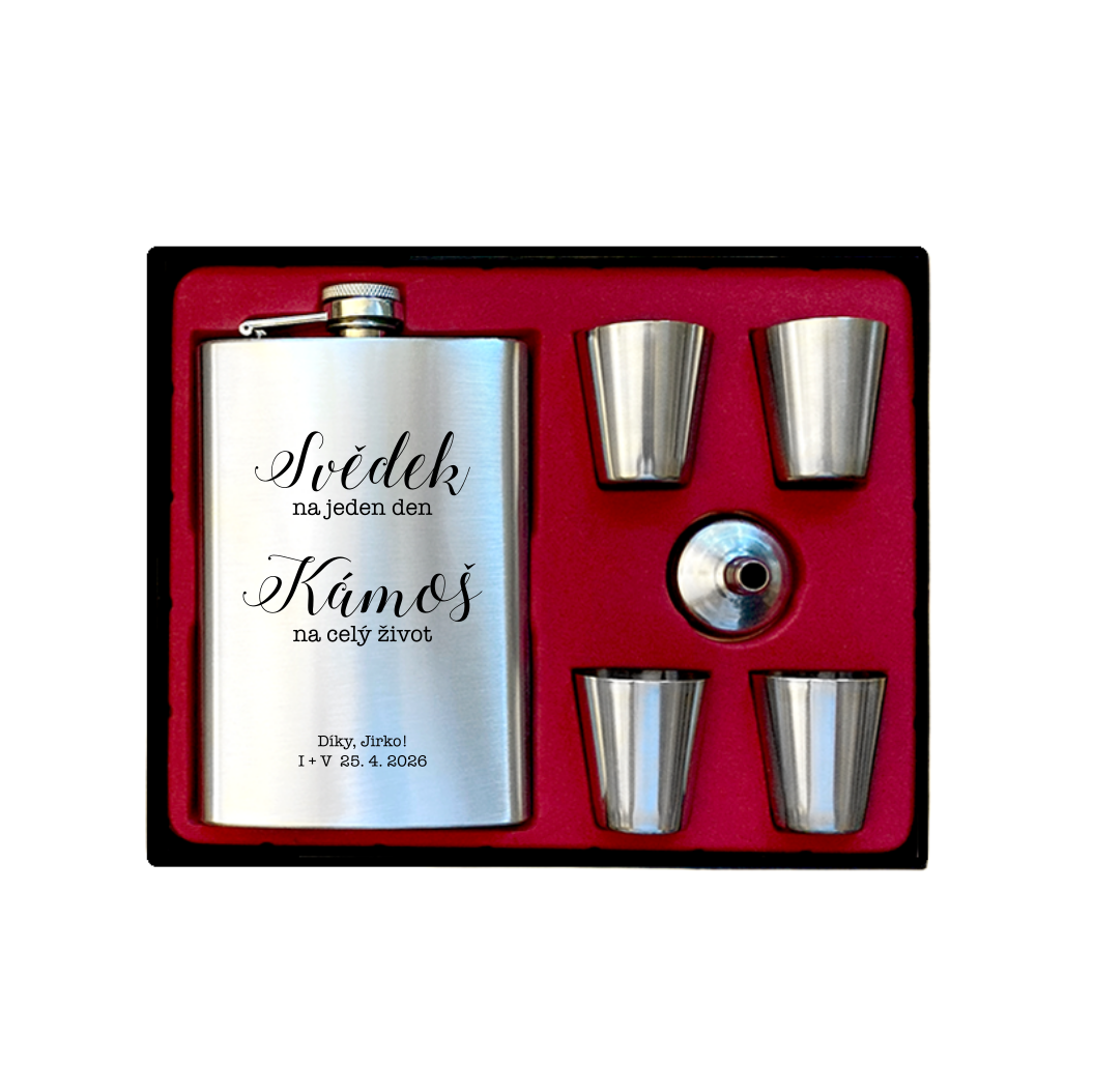Personalizovaná placatka s věnováním pro svědka (kámoše) je elegantní dárek, který působí vtipně i dojemně zároveň. Na přední straně vynikne nápis ve stylu jako na fotografii: „Svědek na jeden den, kámoš na celý život“ a dole osobní věnování. Díky personalizaci vytvoříte originál, který bude mít pro obdarovaného skutečnou hodnotu.