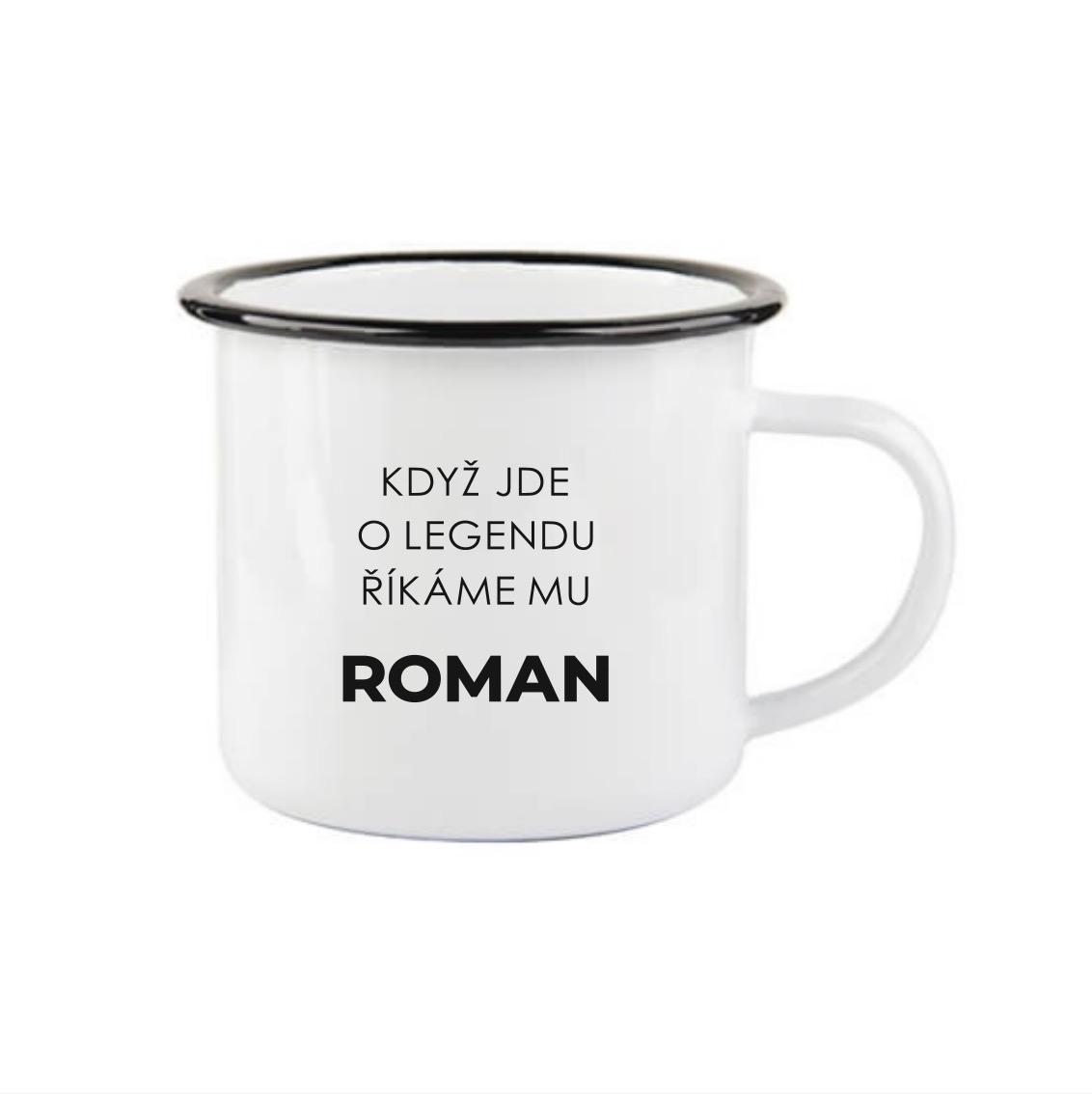 Tradiční bílý smaltovaný hrnek s černým lemem a s vyobrazeným motivem a jménem na přání.
