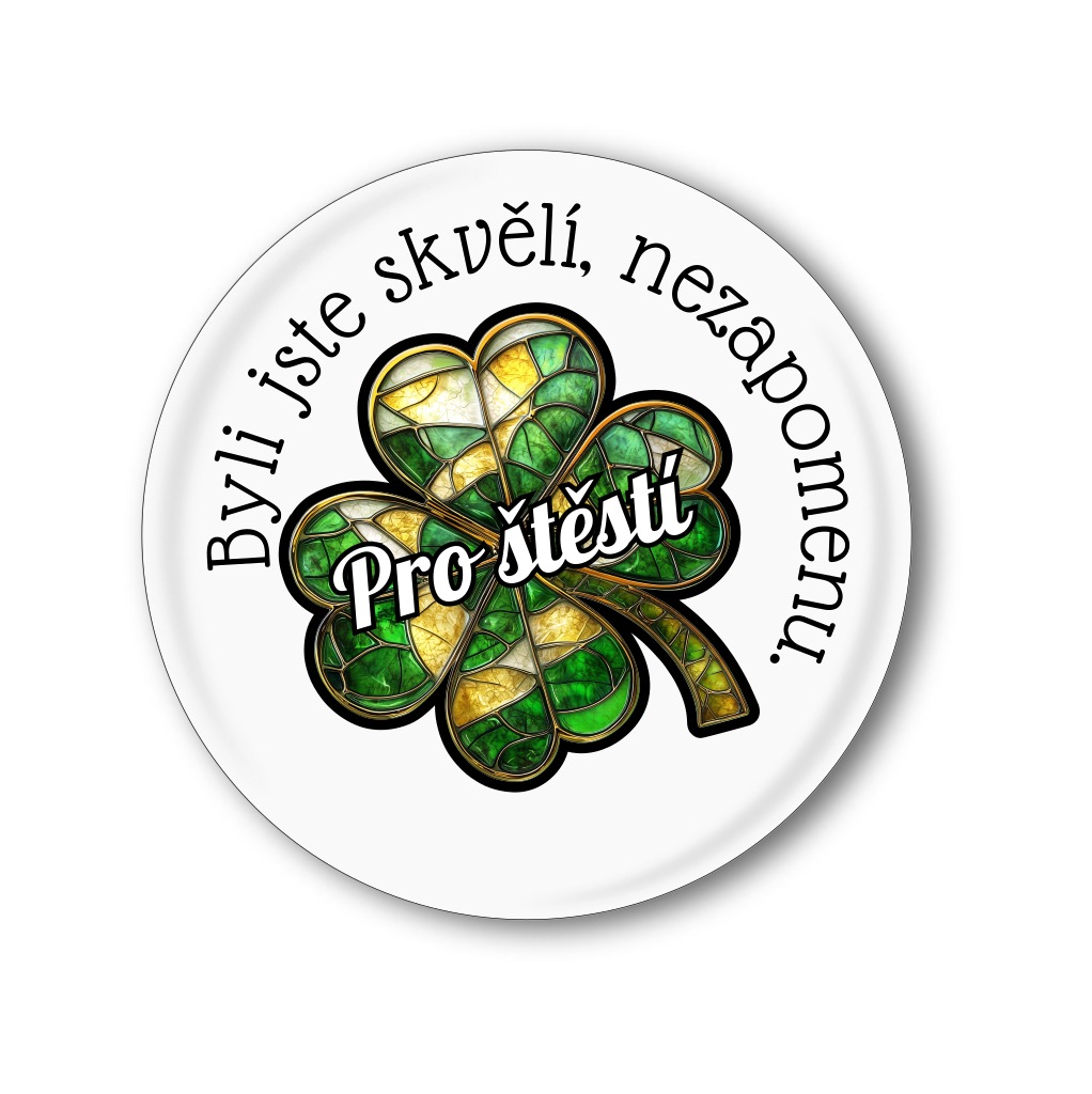 Připínací placky pro žáky s motivem čtyřlístku a nápisem „Pro štěstí“ a " Byli jste skvělí, nezapomenu." Design připomíná barevnou vitráž, která upoutá pozornost a vykouzlí úsměv na tváři. Skvělý dárek pro štěstí pro vaše žáky!