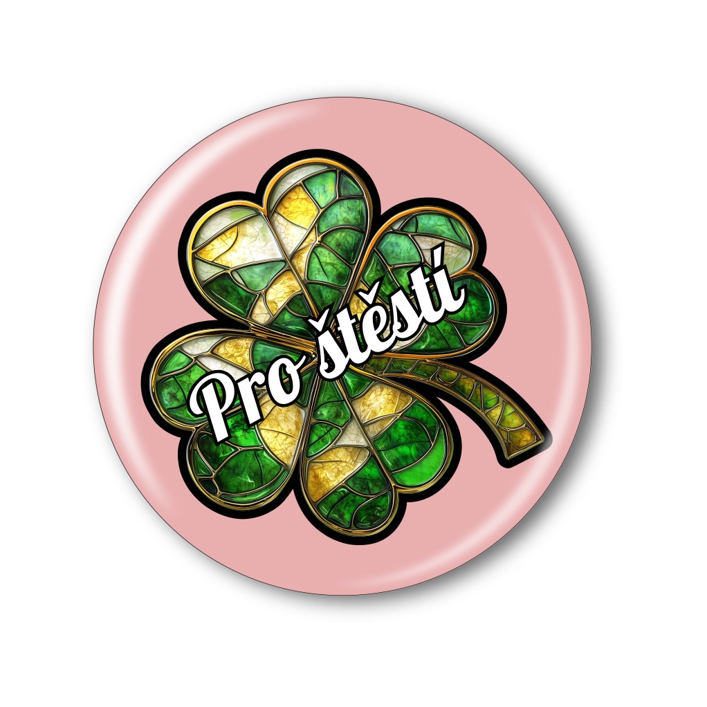 Ozdobte svůj outfit originální připínací plackou s motivem čtyřlístku a nápisem „Pro štěstí“. Design připomíná barevnou vitráž, která upoutá pozornost a vykouzlí úsměv na tváři. Skvělý dárek pro štěstí pro vás i vaše blízké!