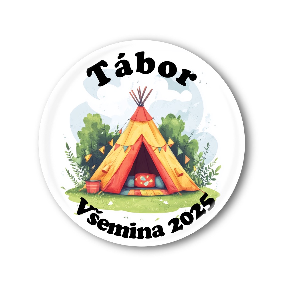 Chystáte se na tábor a hledáte originální doplněk? Nabízíme připínací placku s krásnou grafikou táborového stanu obklopeného přírodou. Text na placku přizpůsobíme podle vašich přání – název tábora, rok, jméno dětského oddílu nebo jiný text dle vašeho výběru!
