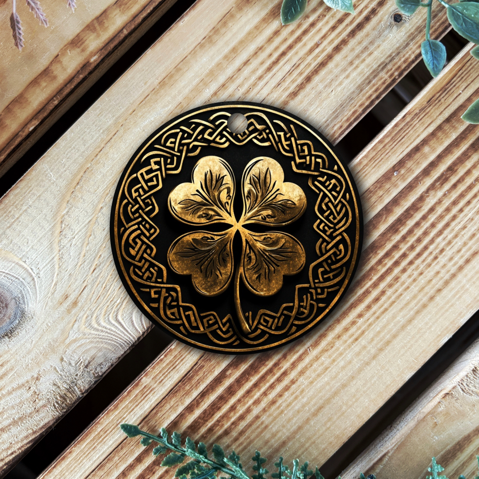Tento přívěsek upoutá na první pohled svým detailním provedením a jedinečným designem. Zlatý reliéf čtyřlístku, který je symbolem štěstí, je propracován do nejmenších detailů, včetně jemných vzorů na listech. Celý motiv je zasazen do kruhu zdobeného keltskými ornamenty, které znázorňují nekonečnost a propojení s přírodou.