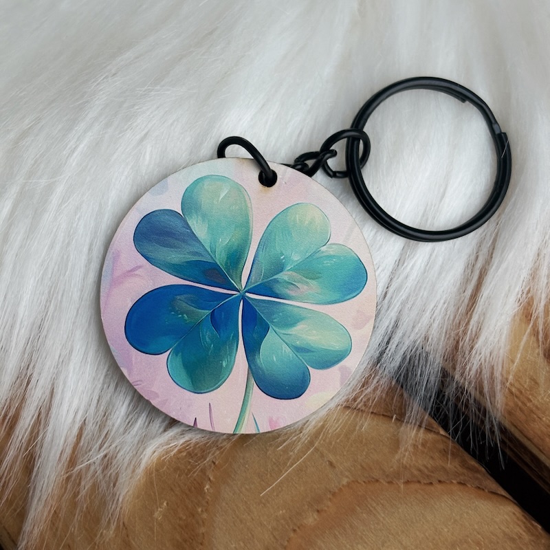 Přívěsek s motivem čtyřlístku, který je symbolem štěstí a pozitivní energie. Tento kulatý přívěsek zaujme svým jemným barevným designem, kde hlavní roli hraje detailní ilustrace čtyřlístku v osvěžujících odstínech modré a zelené, podtržená pastelovým pozadím.