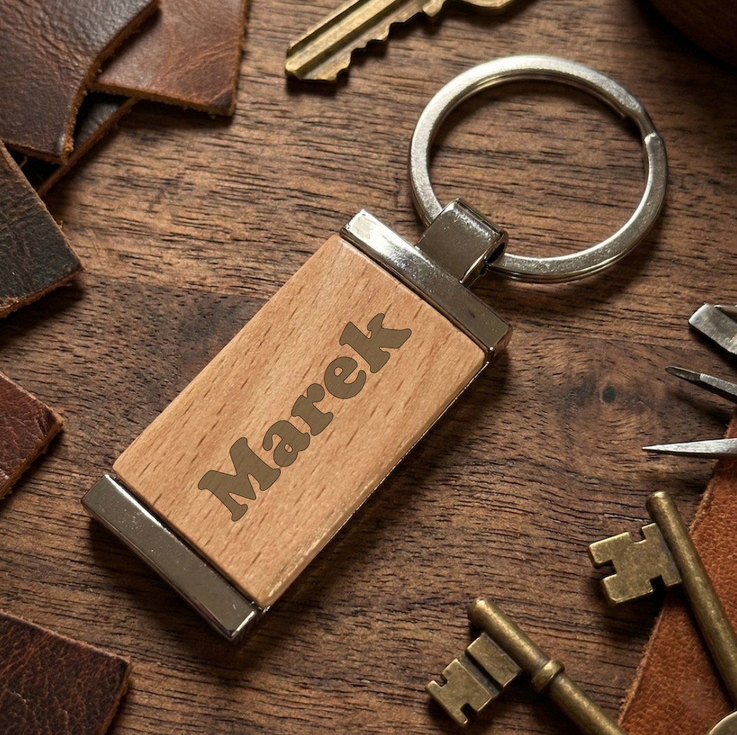 Přívěsek se jménem je osobní doplněk na klíče s gravírovaným (nebo jinak trvale vyznačeným) jménem podle vašeho přání. Kombinace dřevěné části a kovového kroužku působí elegantně, přívěsek se dobře drží a jméno je na první pohled čitelné. Skvěle funguje jako praktická identifikace klíčů i jako milý dárek s osobním významem.