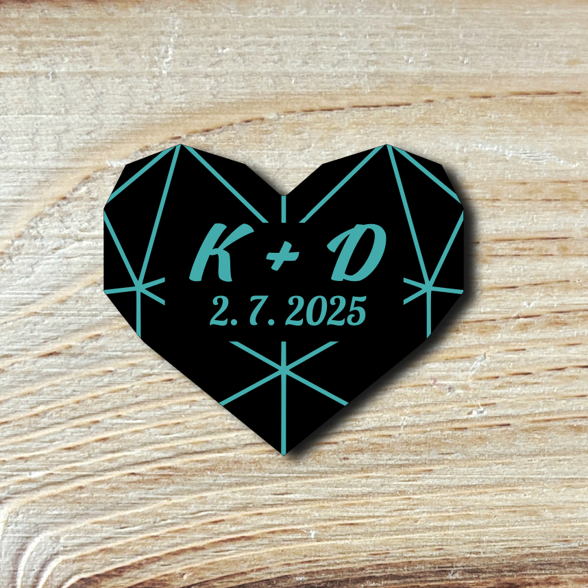 Elegantní svatební brož ve tvaru srdce je krásným a originálním doplňkem ke svatebnímu dni. Vyrobena z kvalitního materiálu s moderním geometrickým vzorem. Na broži se nacházejí iniciály novomanželů a datum svatby, což ji činí jedinečnou vzpomínkou na tento výjimečný den. Motiv brože je možné přizpůsobit podle Vašich požadavků - dejte jí osobní nádech s vlastními iniciály nebo jiným textem dle přání.