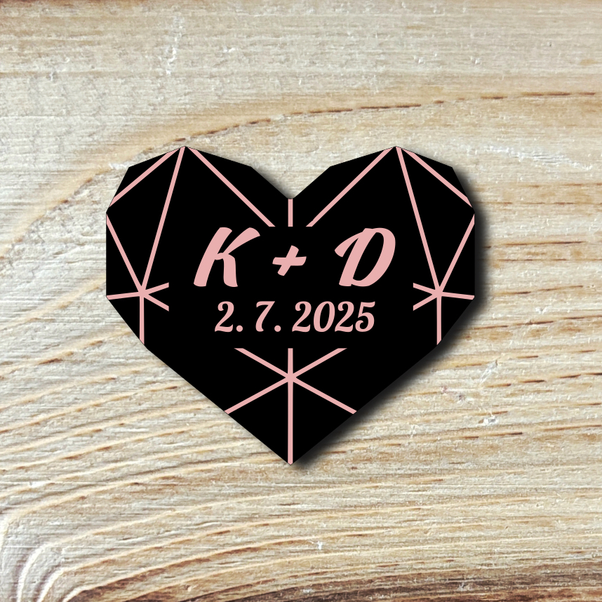 Elegantní svatební brož ve tvaru srdce je krásným a originálním doplňkem ke svatebnímu dni. Vyrobena z kvalitního materiálu s moderním geometrickým vzorem. Na broži se nacházejí iniciály novomanželů a datum svatby, což ji činí jedinečnou vzpomínkou na tento výjimečný den. Motiv brože je možné přizpůsobit podle Vašich požadavků - dejte jí osobní nádech s vlastními iniciály nebo jiným textem dle přání.