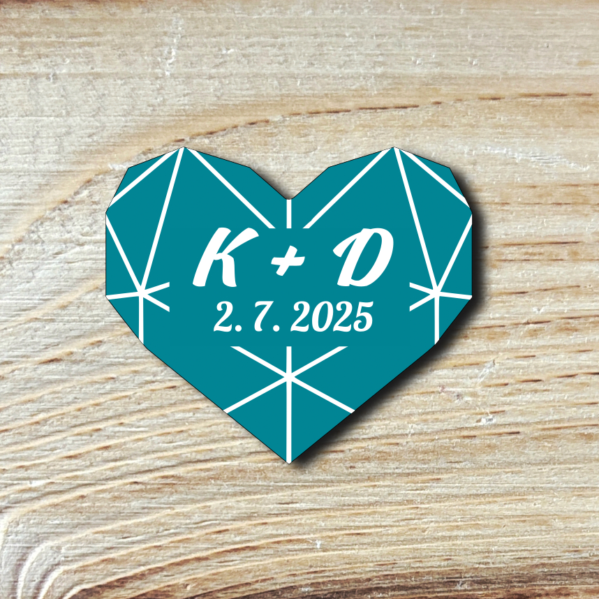 Elegantní svatební brož ve tvaru srdce je krásným a originálním doplňkem ke svatebnímu dni. Vyrobena z kvalitního materiálu s moderním geometrickým vzorem. Na broži se nacházejí iniciály novomanželů a datum svatby, což ji činí jedinečnou vzpomínkou na tento výjimečný den. Motiv brože je možné přizpůsobit podle Vašich požadavků - dejte jí osobní nádech s vlastními iniciály nebo jiným textem dle přání.