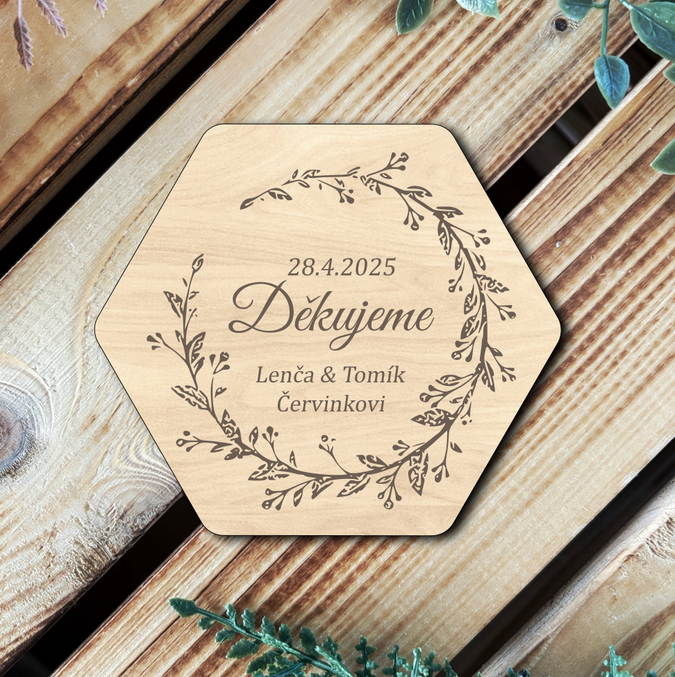 Elegantní hexagonová magnetka s personalizovaným gravírováním je ideálním dárkem pro vaše svatební hosty. Je vyrobena z přírodního dřeva se zachováním krásné kresby, která podtrhne rustikální a moderní svatební styl.