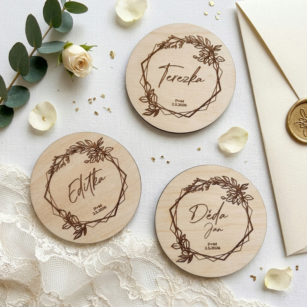 Požadovaná jména hostů a vaše iniciály nám prosím napište do poznámky k výrobku. Jednotlivá jména prosím oddělujte čárkou.