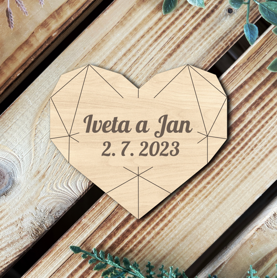 Elegantní srdcová magnetka s personalizovaným gravírováním je ideálním dárkem pro vaše svatební hosty. Je vyrobena z přírodního dřeva se zachováním krásné kresby, která podtrhne rustikální a moderní svatební styl.