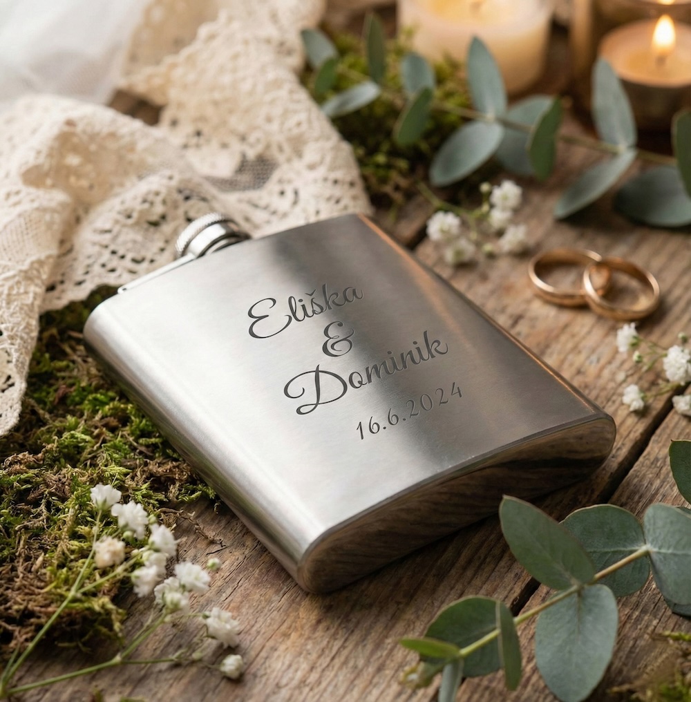 Jedinečný osobní dotek – přizpůsobte si placatku se jmény a datem podle svých představ.