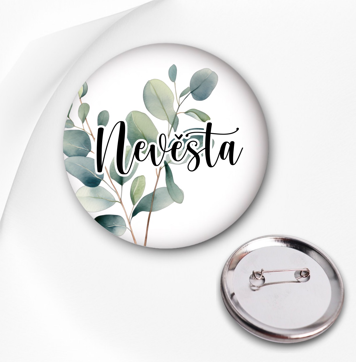 Placka o velikosti 44 mm nebo 58 mm na spínací špendlík. Přední strana je potažena lesklou průhlednou fólií, zadní strana v celokovovém provedení se zavíracím špendlíkem.
