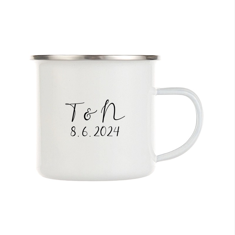 Tradiční bílý smaltovaný hrnek se svatebním motivem.