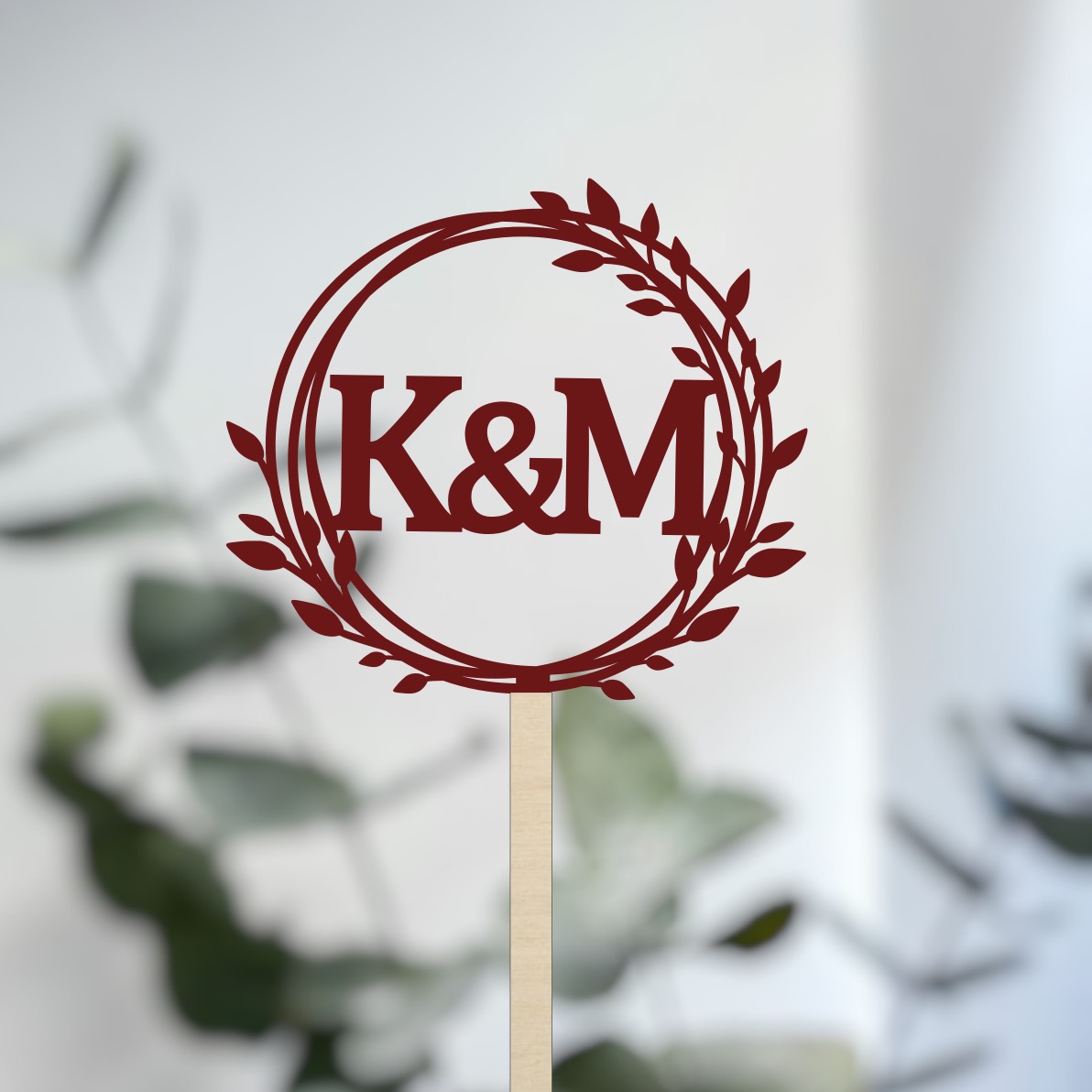 Ozdobný dřevěný zápich do dortu s iniciály novomanželů, díky kterému i z obyčejného dortu vytvoříte dort jedinečný, který bude každý obdivovat.