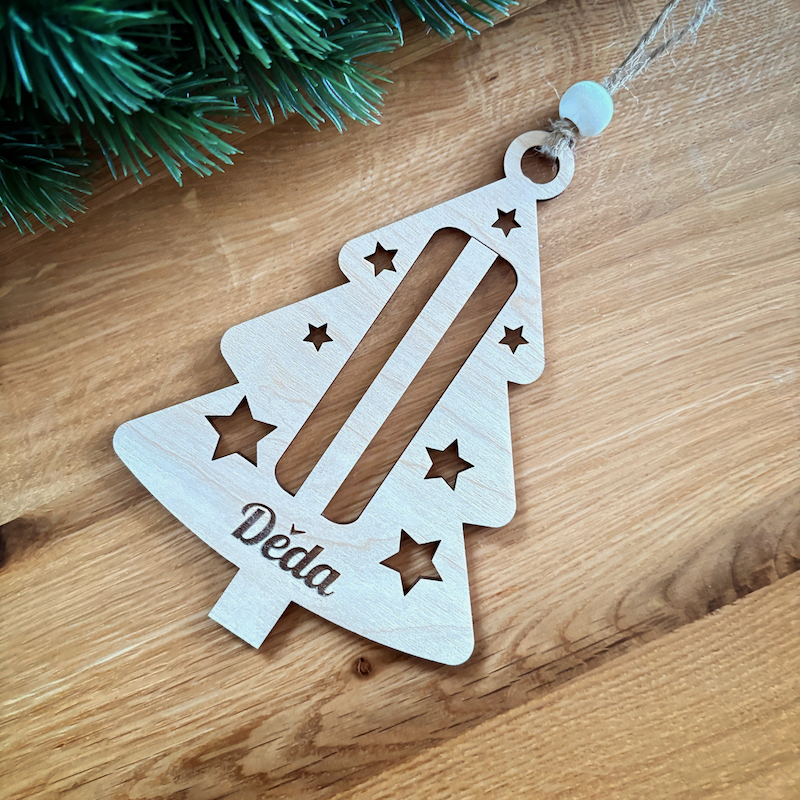 Dřevěná vánoční ozdoba se jménem jako originální způsob darování peněz.