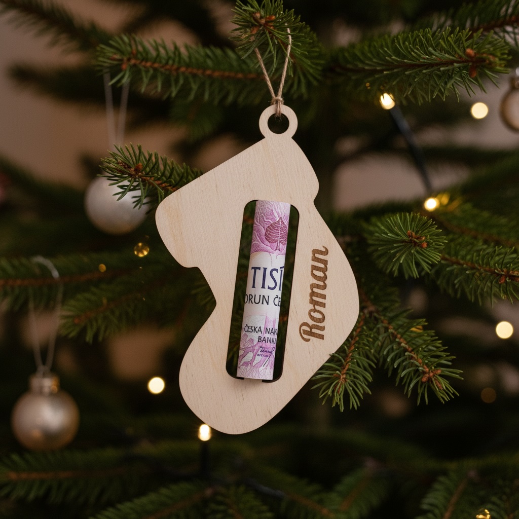 Hledáte způsob, jak letos o Vánocích darovat peníze stylově a originálně? Dřevěná vánoční ozdoba se jménem na přání je perfektním řešením! Tento jedinečný kousek kombinuje krásný design vánoční dekorace s praktickým využitím pomocí klipu na vložení bankovky, udělá z klasického daru peněz i hezký zážitek. Jméno dodá ozdobě osobní dotek a stane se tak nejen krásnou vzpomínkou na Vánoce, ale také ozdobou, kterou lze každý rok na stromečku znovu použít.