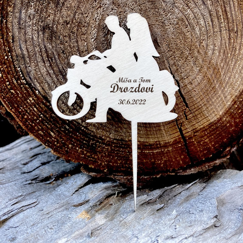 Tento originální dřevěný svatební zápich je dokonalým doplňkem pro novomanžele, kteří milují dobrodružství! Zápich je vyřezaný z březového dřeva a zobrazuje zamilovaný pár na motorce, což symbolizuje svobodu a vzrušení z nové životní cesty. Kromě toho je personalizovaný jmény novomanželů a jejich společným příjmením a datem svatby, což mu dodává jedinečný a osobní rozměr.